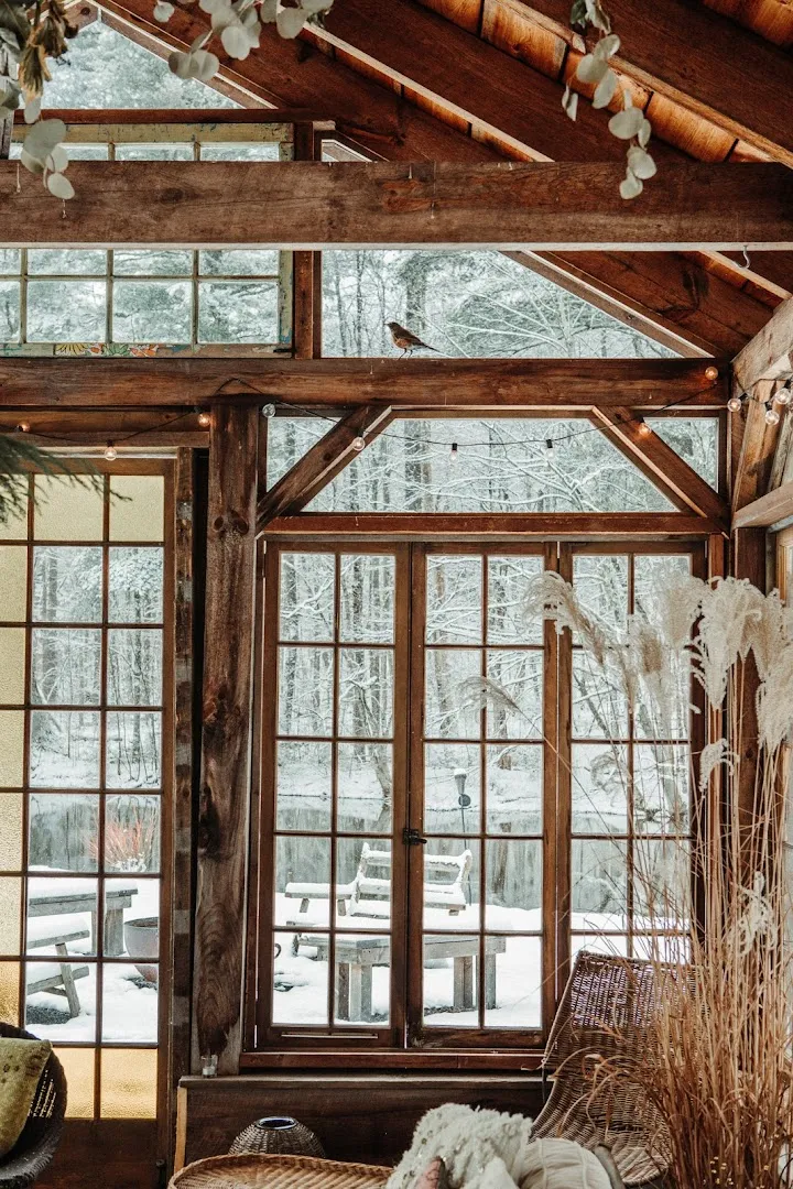 🔥 Glasshouse Spot: In chillier months, the glasshouse makes a peaceful place to sip wine and watch the last light over the pond.