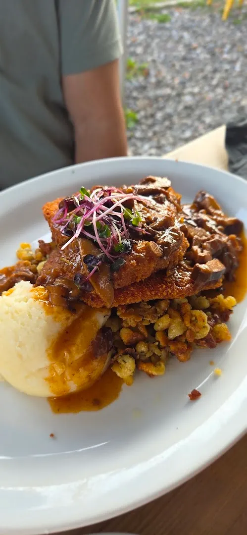 Steins clash and sausage sizzles beneath a high timber ceiling, mountain light filling the room. German drafts, hand-rolled pretzels, and fireside tables back up a menu of schnitzel and fondue.