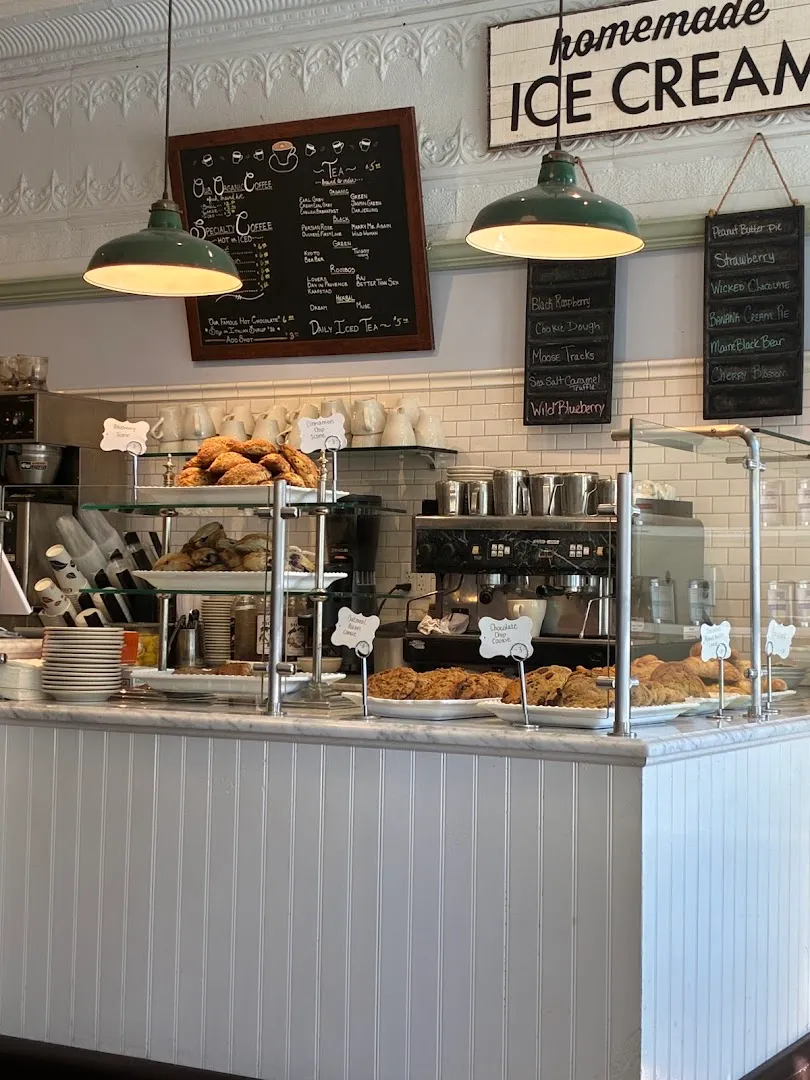 Scones, waffles with berries, meatloaf panini, chicken salad sandwich, turkey and cheese sandwich on homemade bread, quiche, cookies, crepes, potato salad, beet salad, soups, ice cream, hot and cold coffee drinks, tea selection, paninis, small plates, organic and vegetarian options.