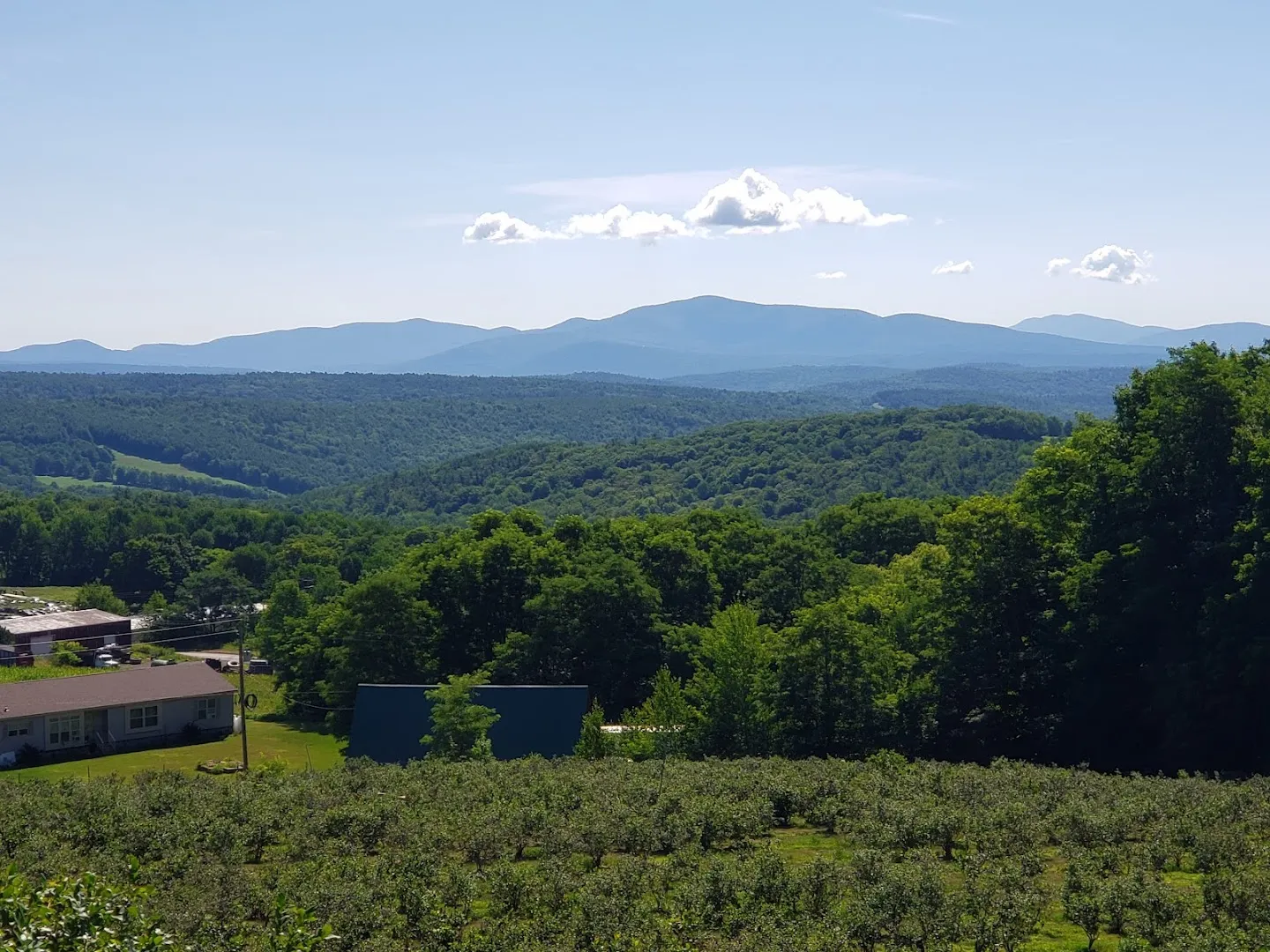 Up a gravel road and through the woods, Blue Sky Blueberries lies open to the sky and the sound of wind moving through fruit-laden bushes. The gravel crunches underfoot, while the hills stretch green beyond the fields.