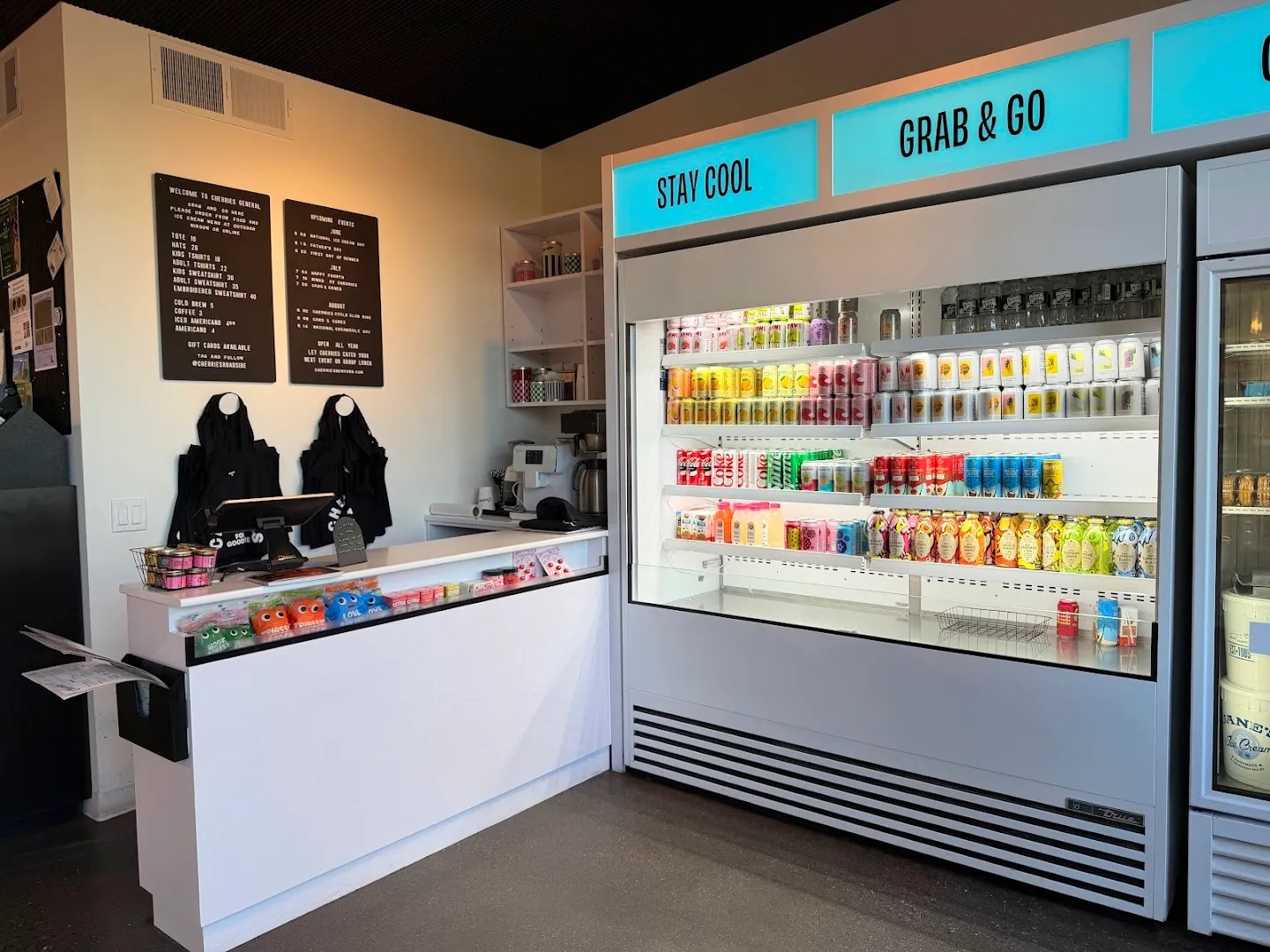 🛒 Indoor shop stocked with snacks, drinks, and bright merch