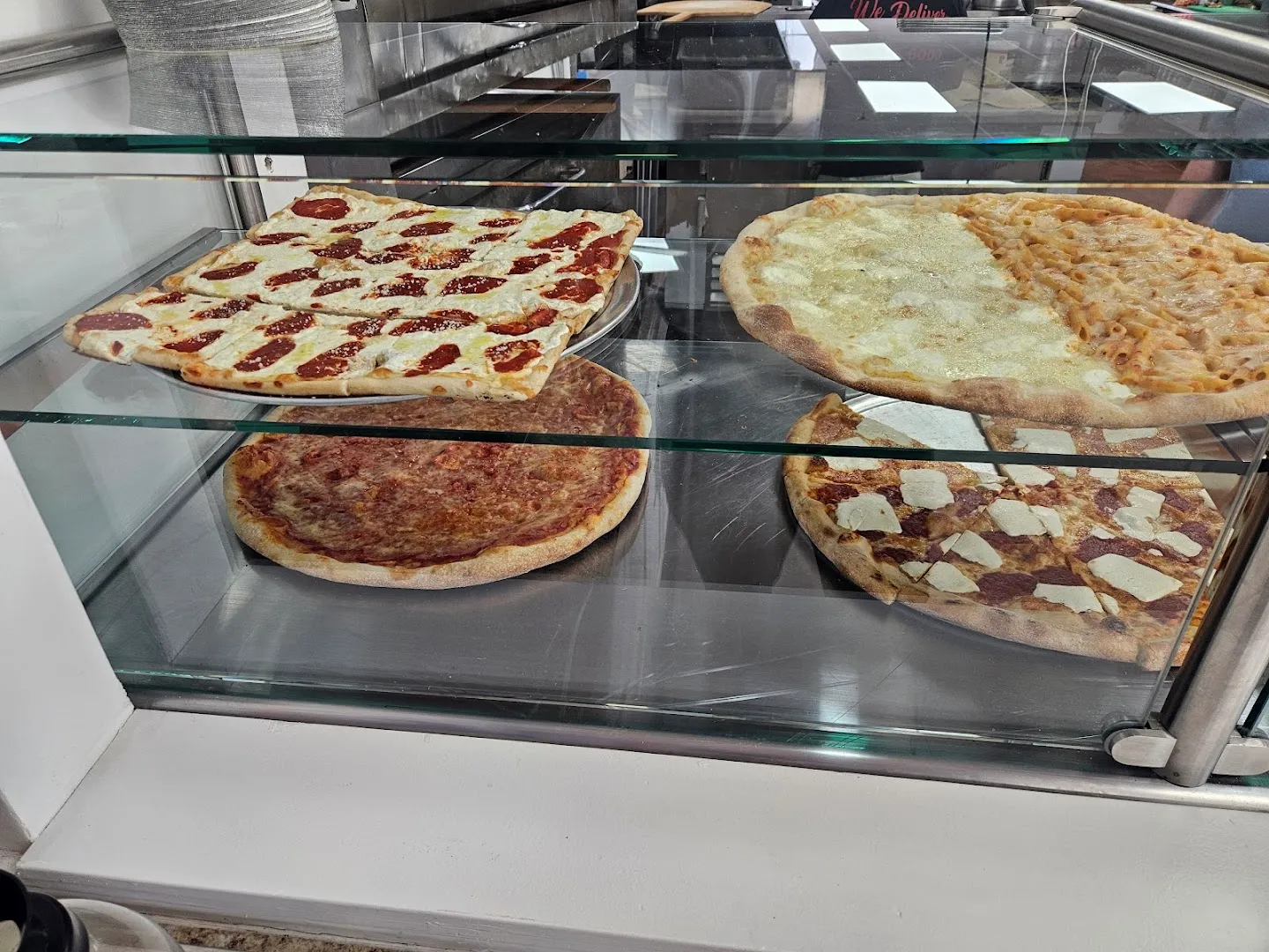 The smell of griddled pizza crust and fryer oil hangs thick as you walk in. Counter workers shout orders above the clang of metal tables, while kids crowd the ice cream cooler just inside the door.