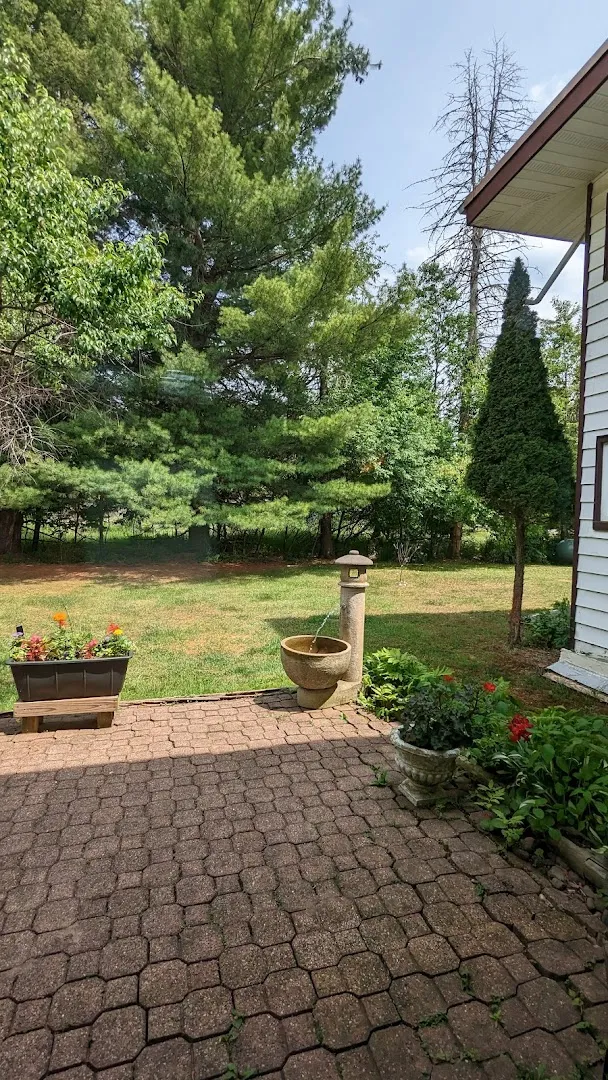 Sun streams through the trees and lands on a house that feels closer to a lived-in home than a formal retreat. Voices drift from the kitchen, and out back, birds gather at the feeder while the pond hums quietly in the background.