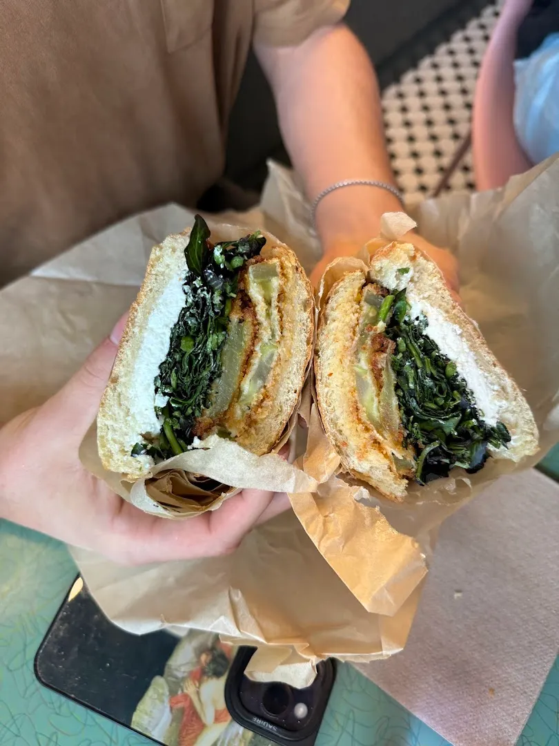 Biscuits with butter and jam, Biscuit egg and cheese sandwich, Sausage egg and cheese biscuit, Hot honey fried chicken biscuit, Seasonal biscuit specials, Housemade bagels, Sourdough sandwiches, Salads, Cookies (salted chocolate, seasonal), Matcha lattes, Cappuccino, Pies.
